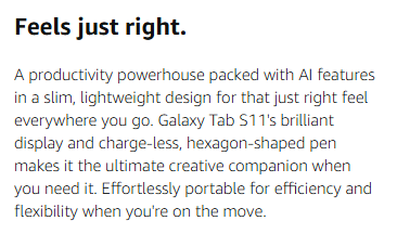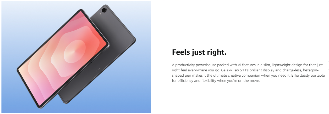 • Slim and light productivity powerhouse: Formidable AI tablet features in a slim, lightweight and effortlessly portable design; Galaxy Tab S11's brilliant display and charge-less, hexagon-shaped pen make it the ultimate creative companion