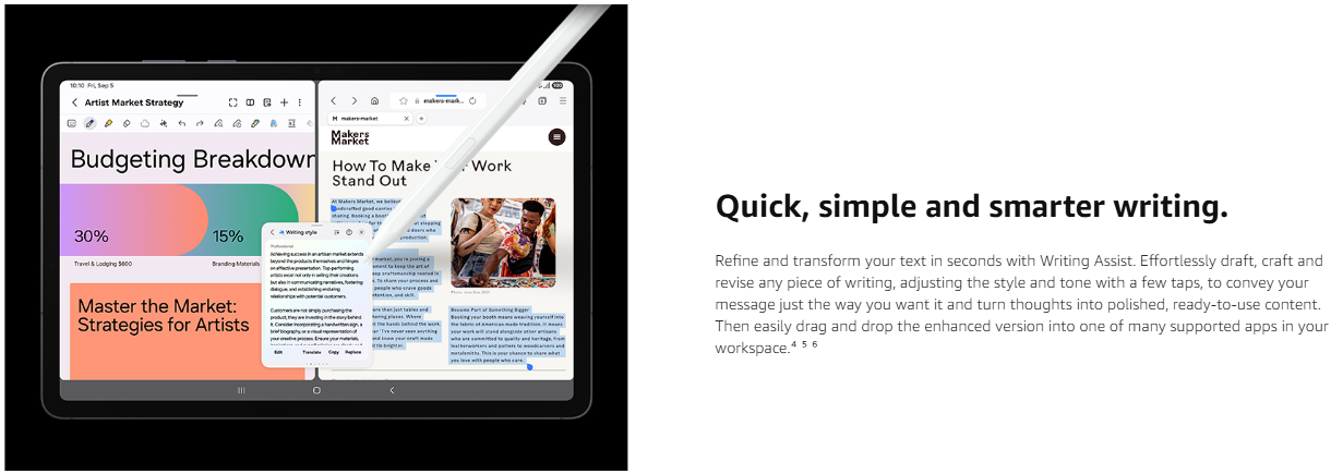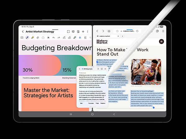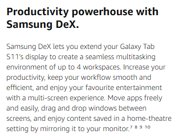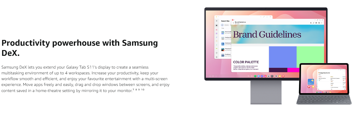• Samsung DeX: Extend your Galaxy tablet's display to create a multitasking environment of up to 4 workspaces; Increase your productivity with drag and drop windows and movable apps, and enjoy saved content at home with screen mirroring