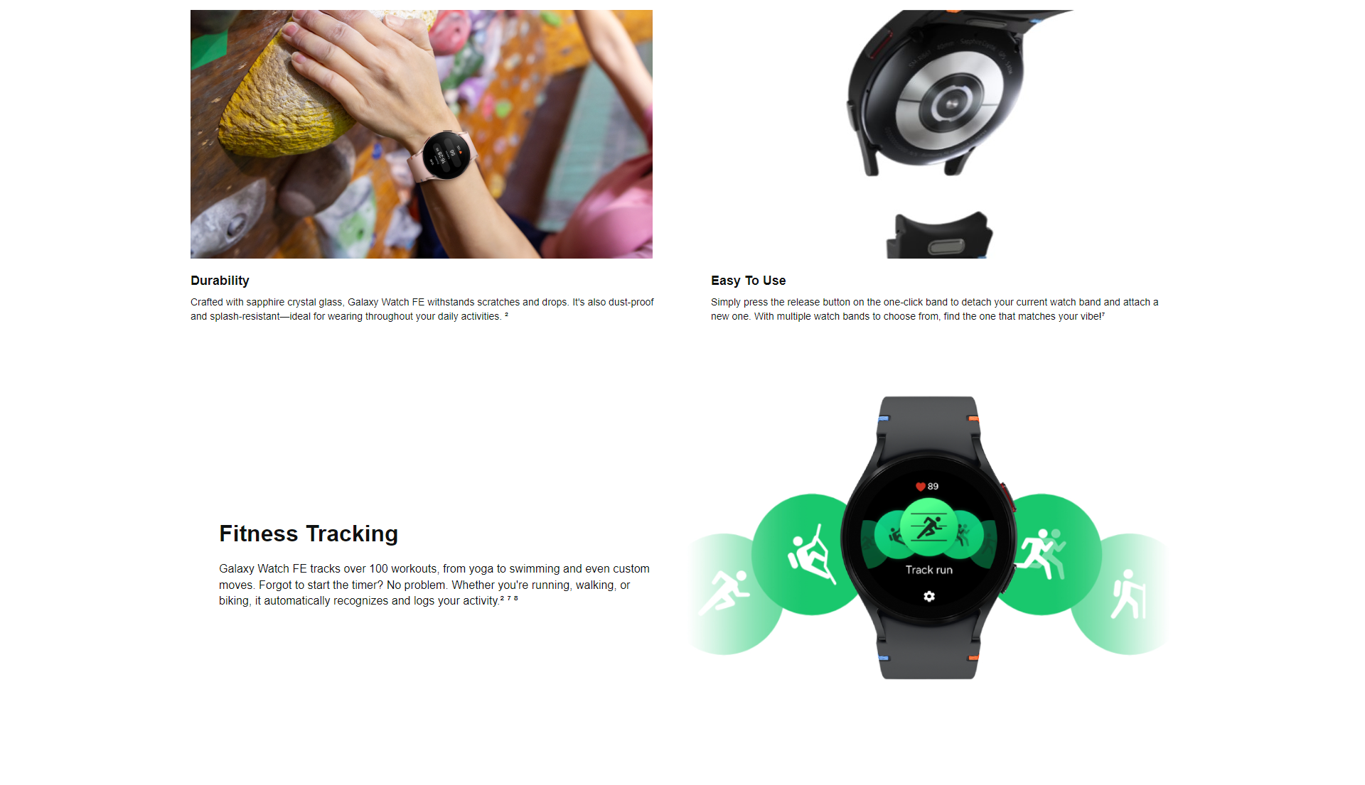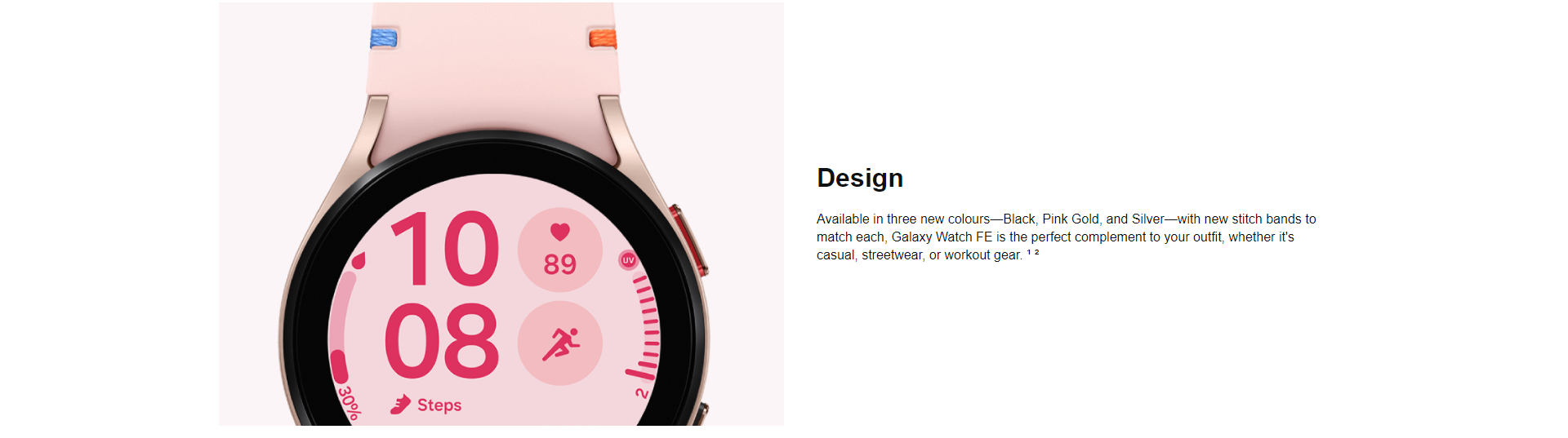 • Available in three new colours: Black, Pink Gold, and Silver with new stitch bands to match each, Galaxy Watch FE is the perfect complement to your outfit, whether it's casual, streetwear, or workout gear. ¹ ²
