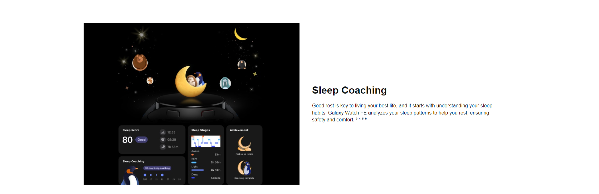 • Good rest is key to living your best life, and it starts with understanding your sleep habits. Galaxy Watch FE analyses your sleep patterns to help you rest, ensuring Watch FE safety and comfort. ² ³ ⁴