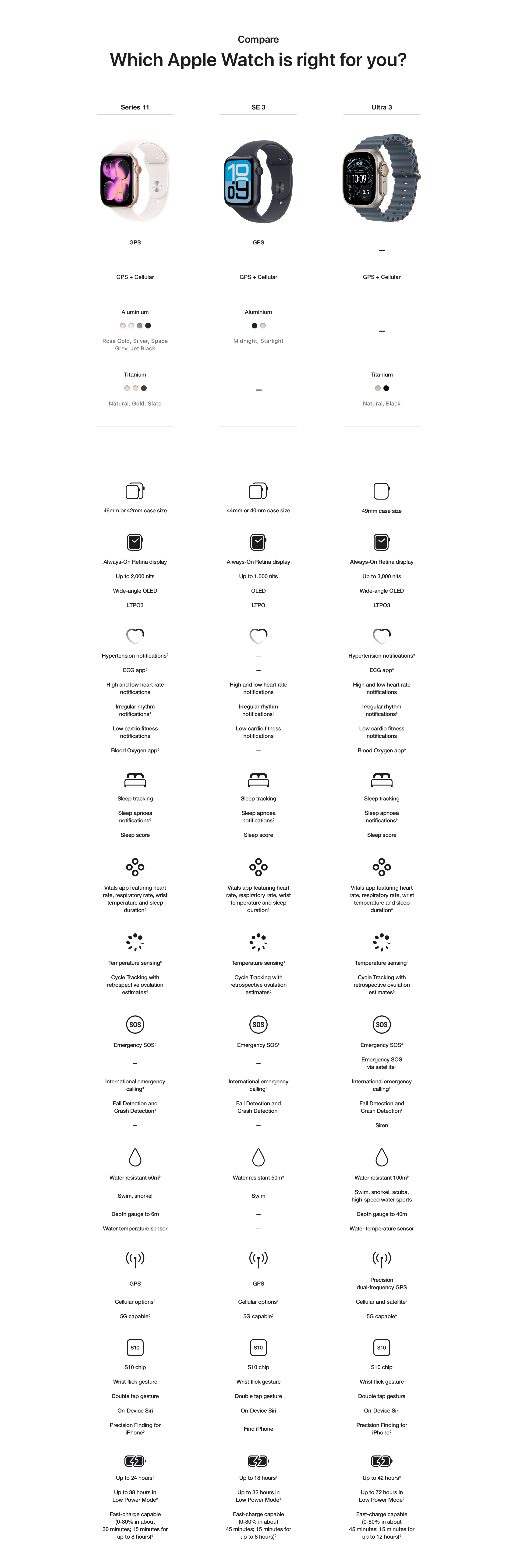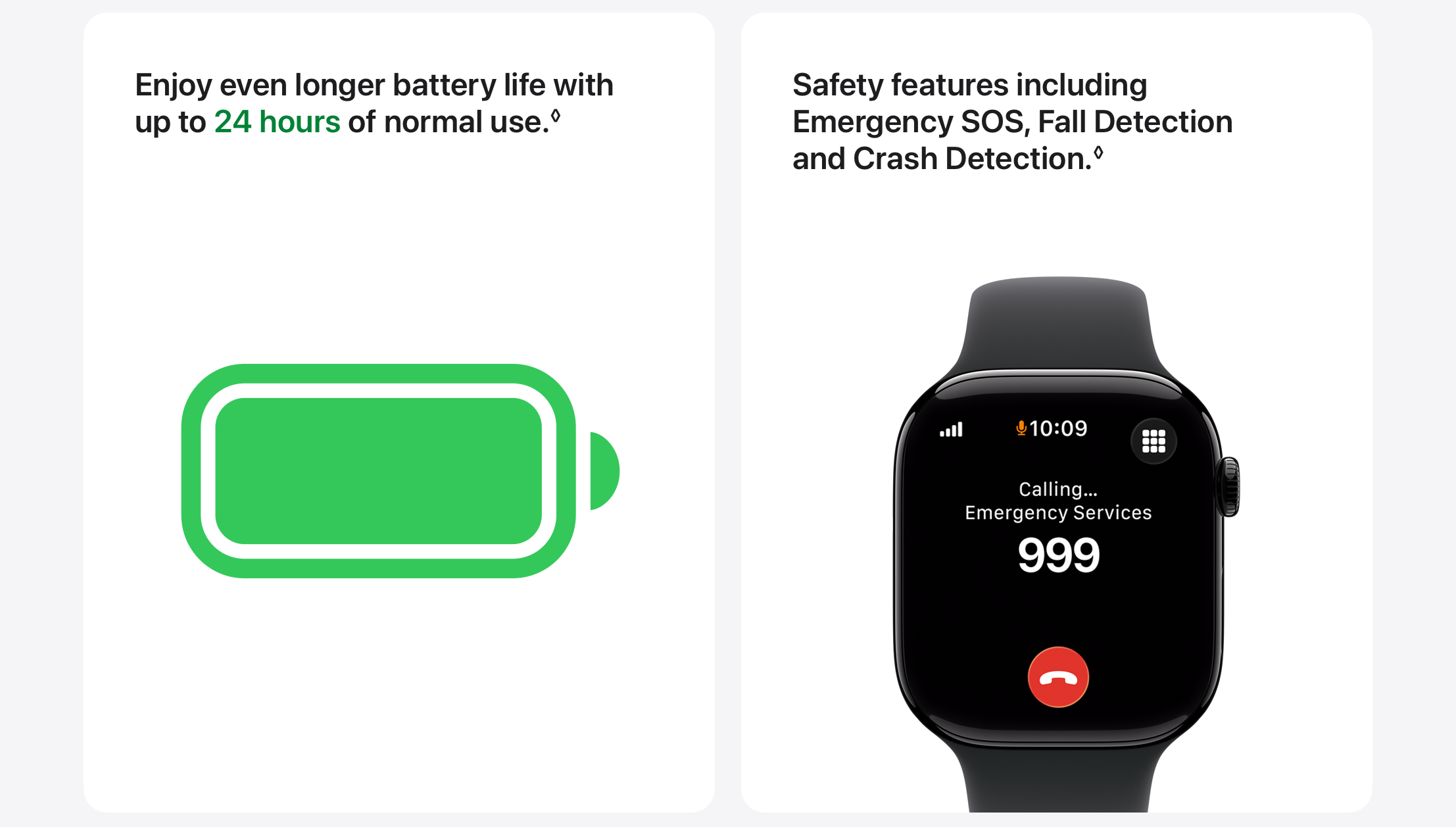 • SAFETY FEATURES — Series 11 can detect a hard fall or serious car crash, automatically help connect you with emergency services and notify your emergency contacts. Check In can automatically notify a loved one when you’ve arrived at your destination.