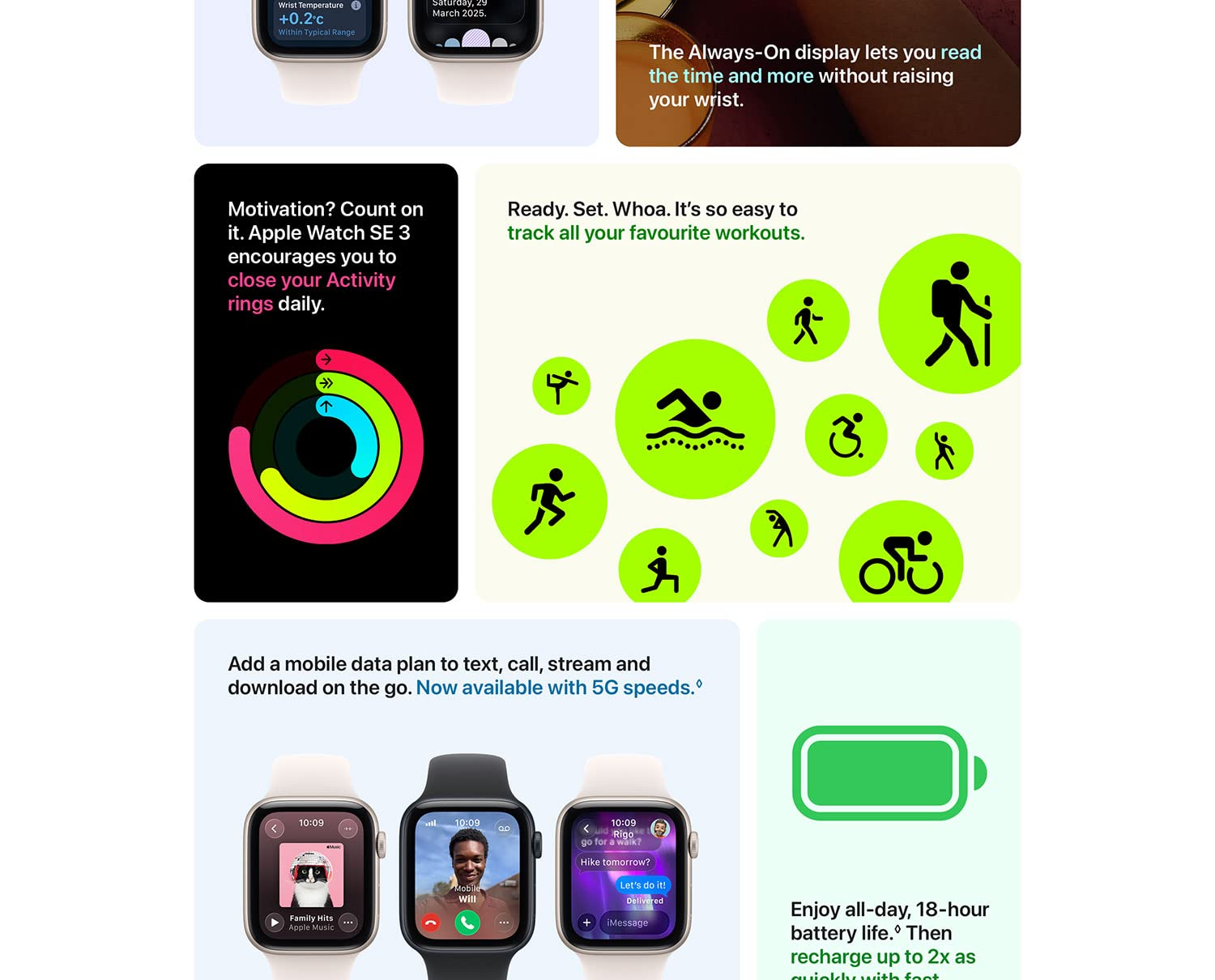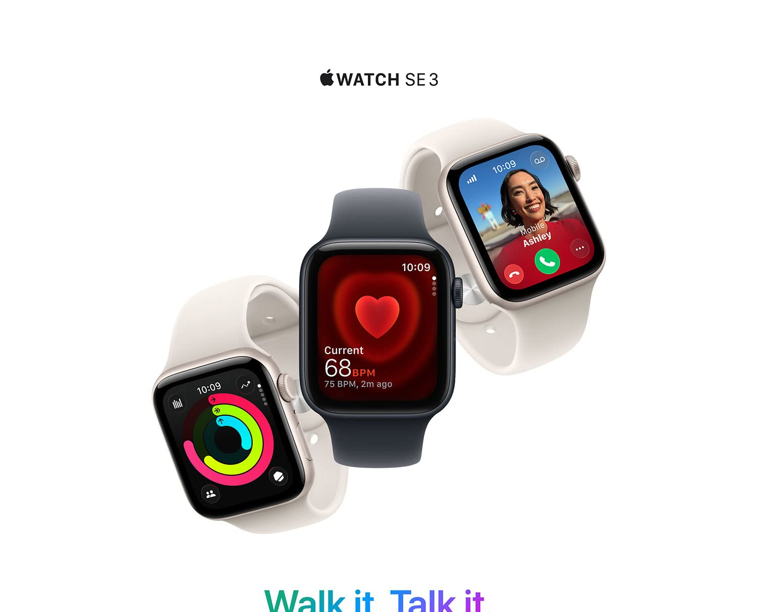 • STAY CONNECTED — Send a text, take a call, listen to music and podcasts, use Siri and get notifications. Apple Watch SE 3 (GPS) works with your iPhone or Wi-Fi to keep you connected.
