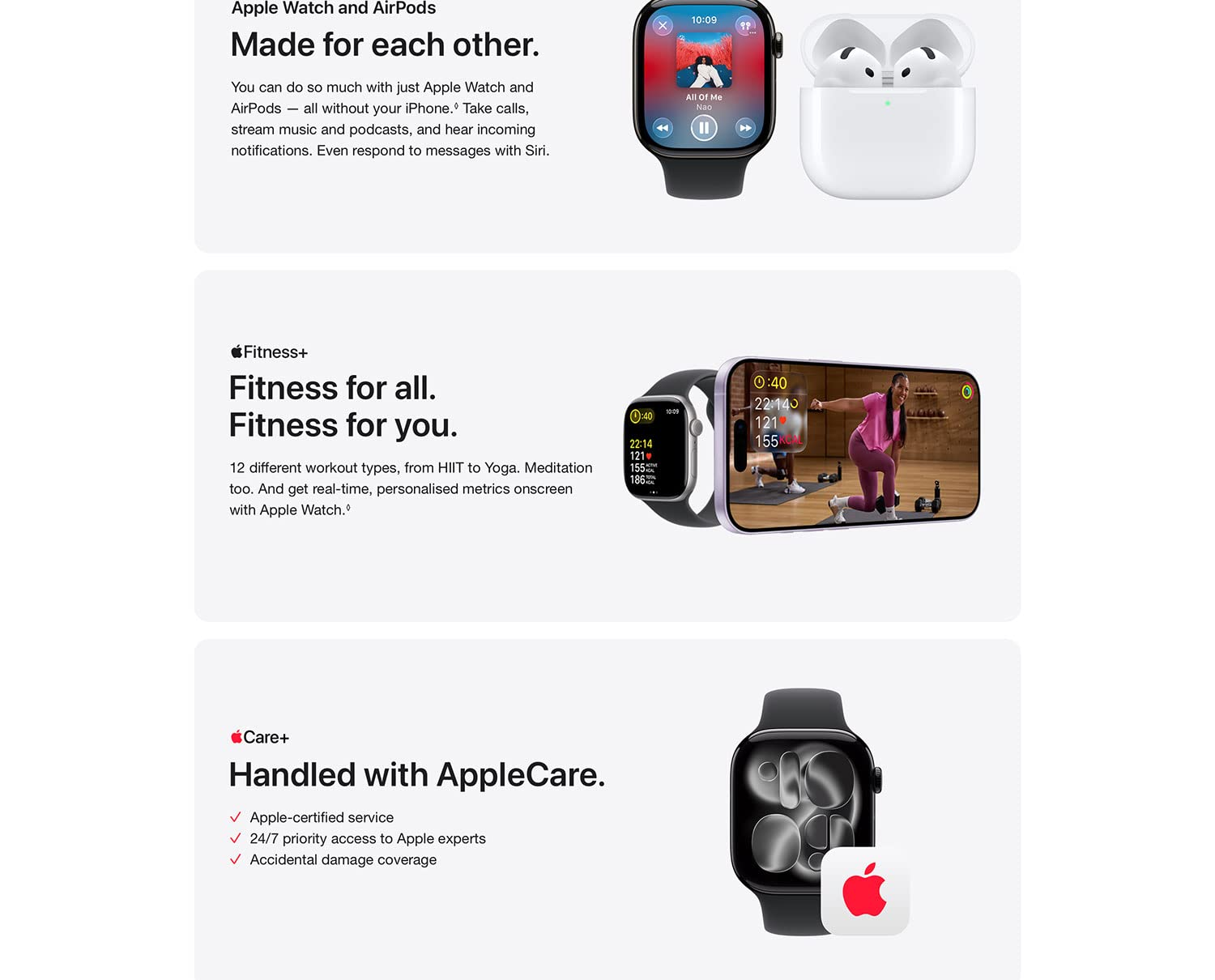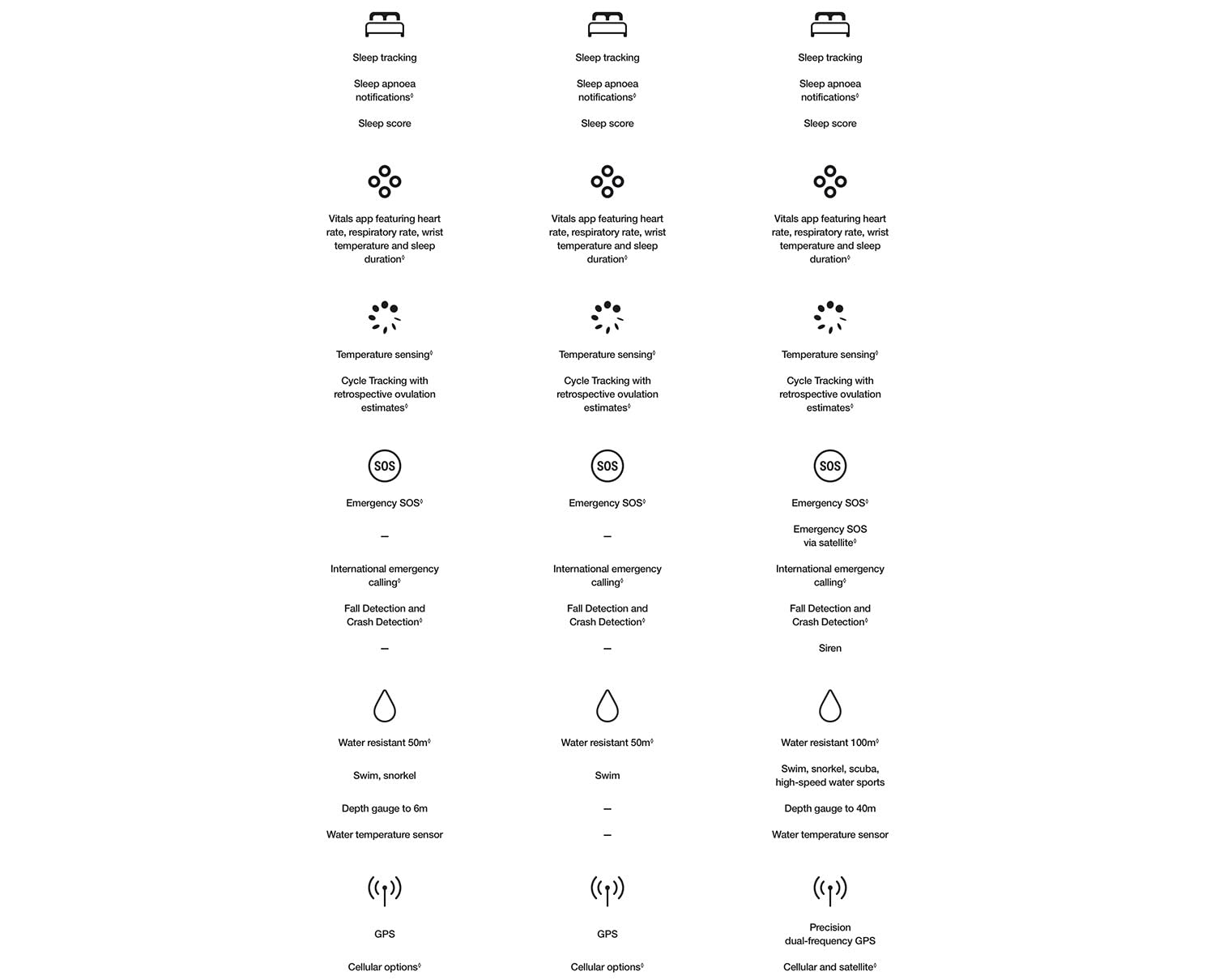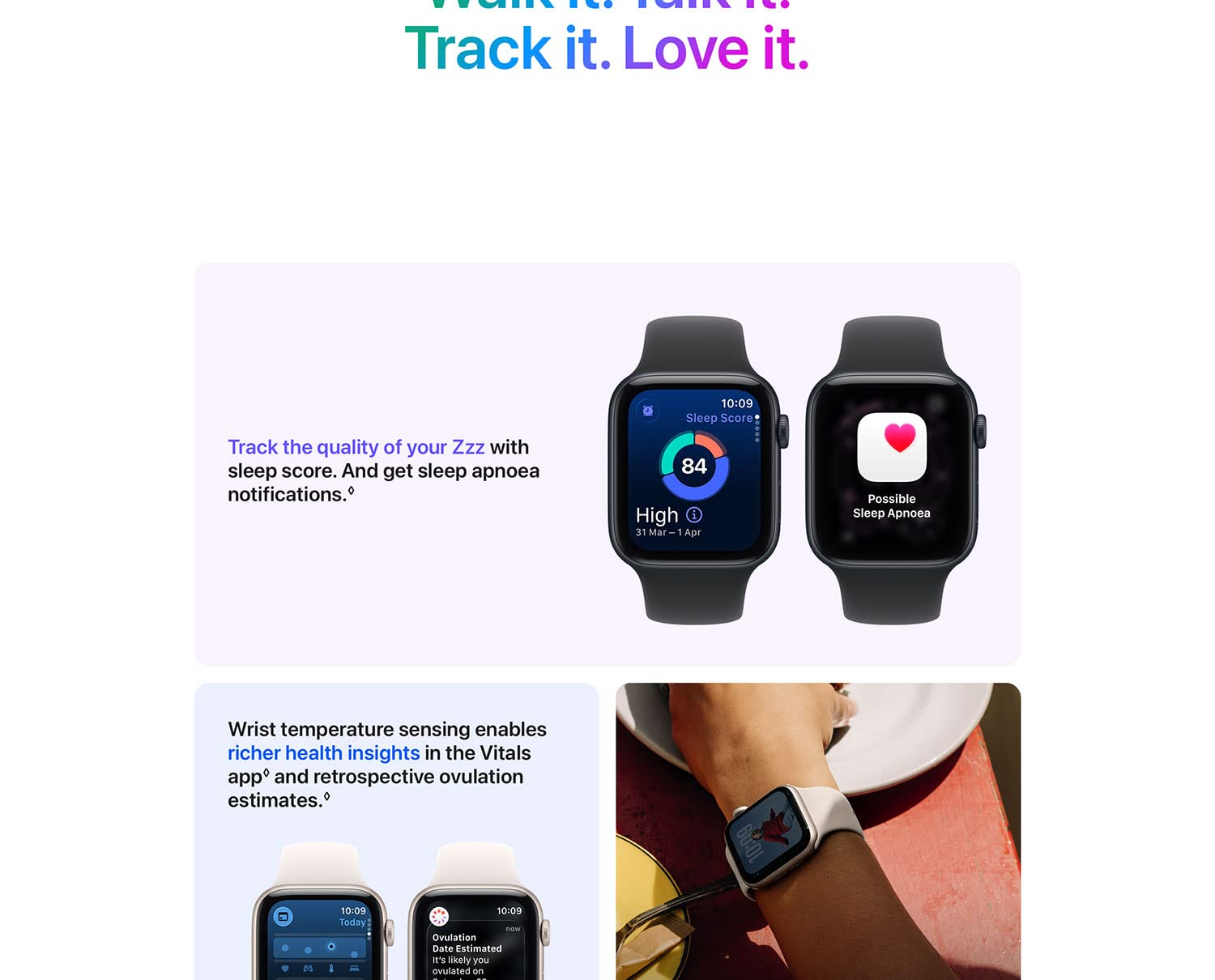 • HEALTH ESSENTIALS — Temperature sensing enables richer insights in the Vitals app and retrospective ovulation estimates. You’ll also get a daily sleep score, sleep apnoea notifications, and be alerted if you have a high or low heart rate or an irregular rhythm.