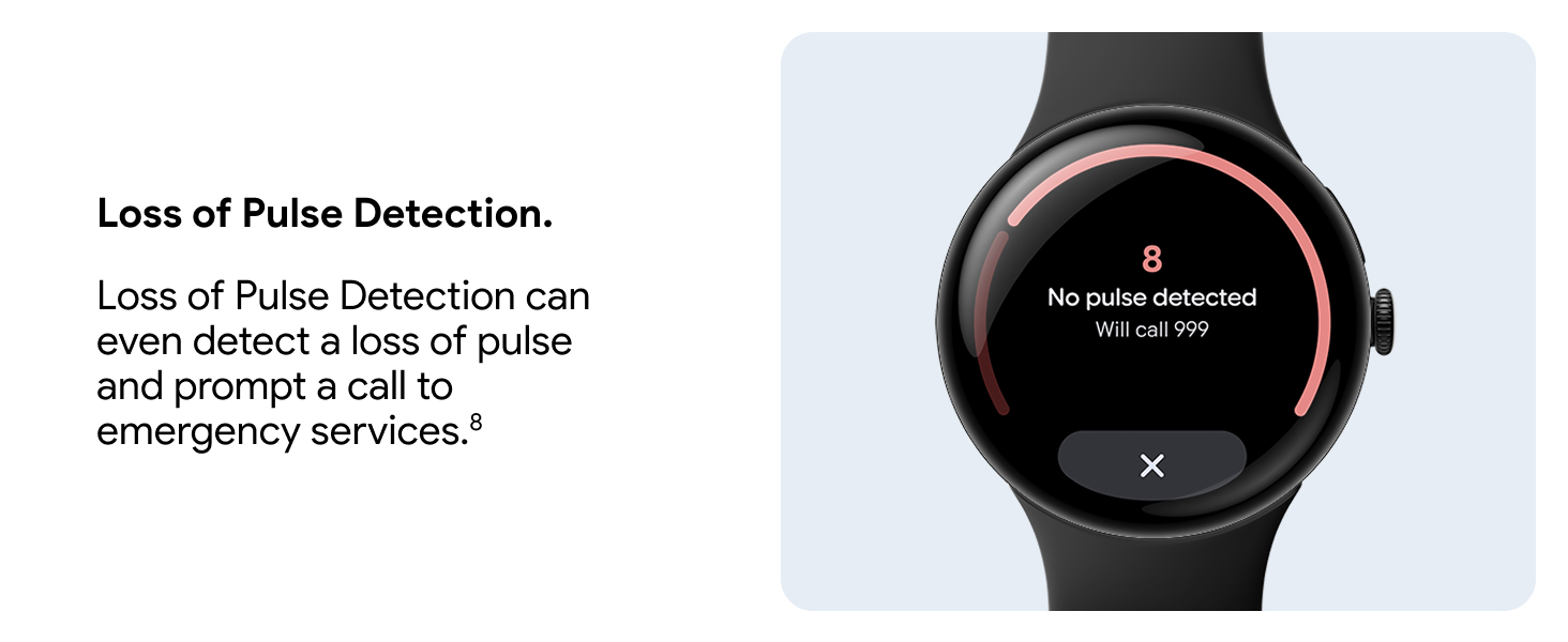 • Detects loss of pulse, then calls for help. Loss of Pulse Detection can detect a loss of pulse event and prompt a call to emergency services for potentially lifesaving help.