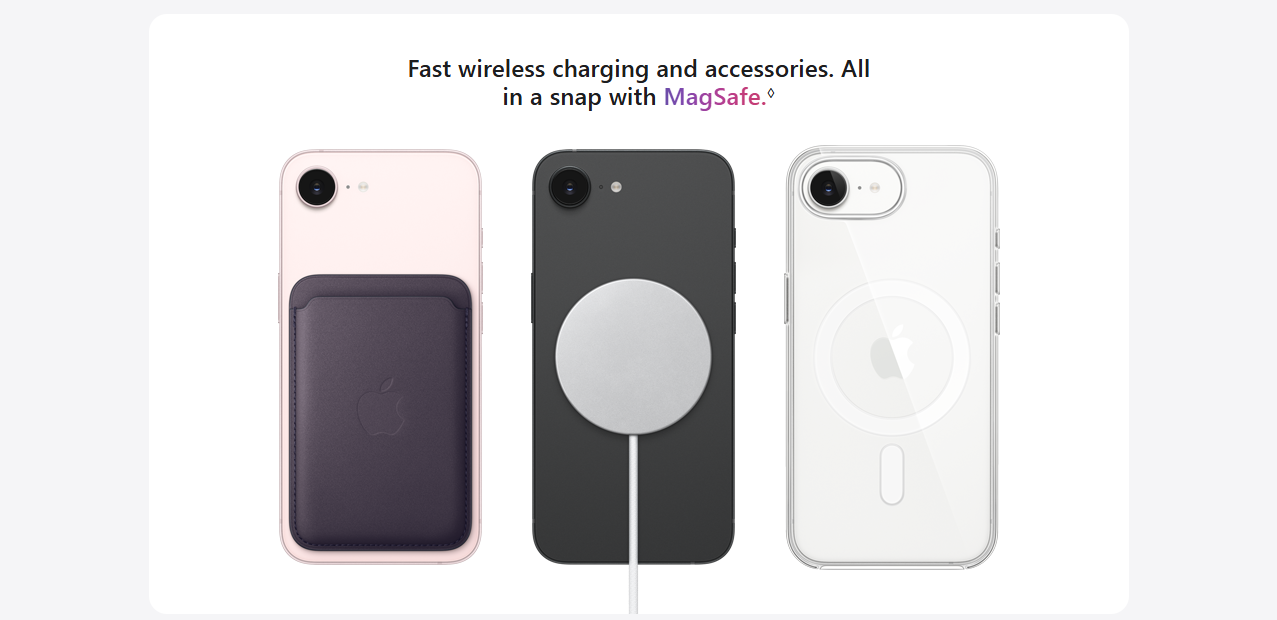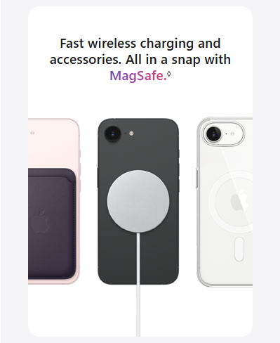 • FAST WIRELESS CHARGING. ALL IN A SNAP WITH MAGSAFE — iPhone 17e lets you charge wirelessly up to 15W, compared to 7.5W with iPhone 16e. That means when you need to charge, it’s easy, convenient and fast.