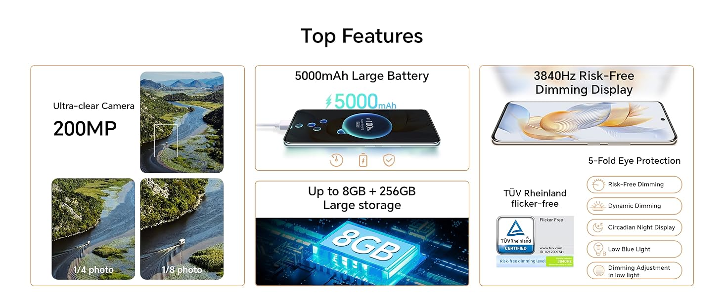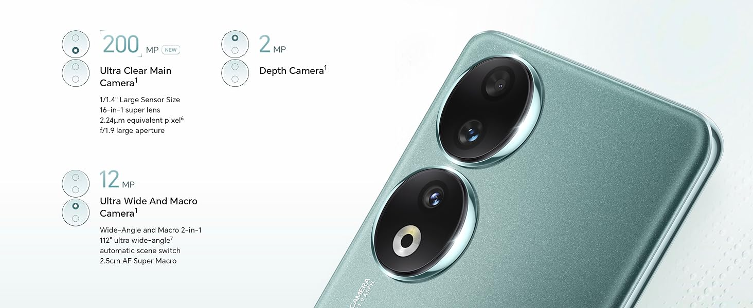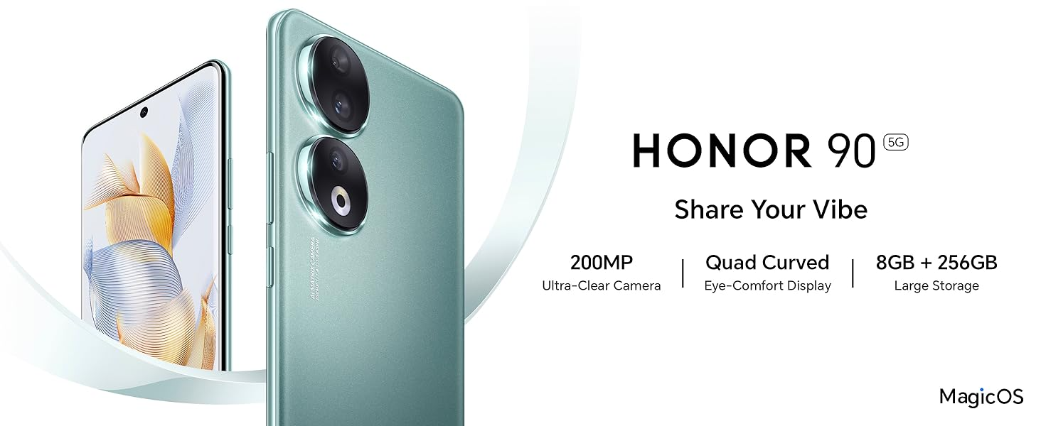 • 【200MP Master of Photography 】 HONOR 90 features a 200MP all-new triple camera system and a 50MP selfie camera to capture exquisite photos and videos; With the Portrait mode, HONOR 90 further enhances the portraits taken under all lighting conditions