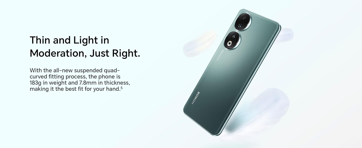 • 【6.7-inch 120Hz AMOLED Display】Equipped with a 6.7-inch quad-curved bezel-less display, HONOR 90 supports a high resolution of 2664x1200, 100% DCI-P3 color gamut, up to 1.07 billion colors, and a peak HDR brightness of 1600 nits, bringing visual content to life in stunning colors and vivid clarity
