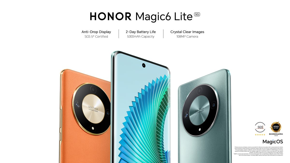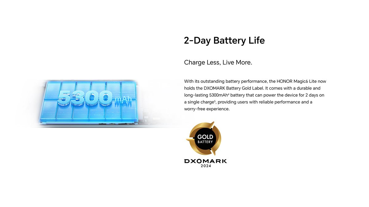 The HONOR Magic 6 Lite comes with an industry-leading 5300mAh battery that can power the device for an entire day, making it ideal for all-day productivity and a worry-free user experience. With the Gold Label recognition from DXOMARK, the HONOR Magic 6 Lite supports 3 days of use for uninterrupted work, play and entertainment on the go.