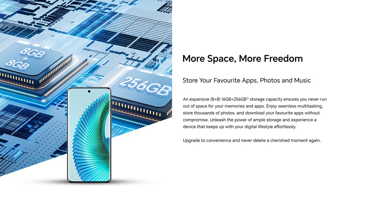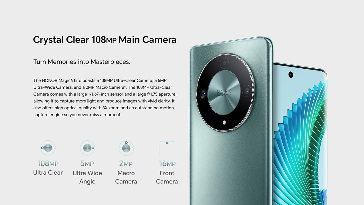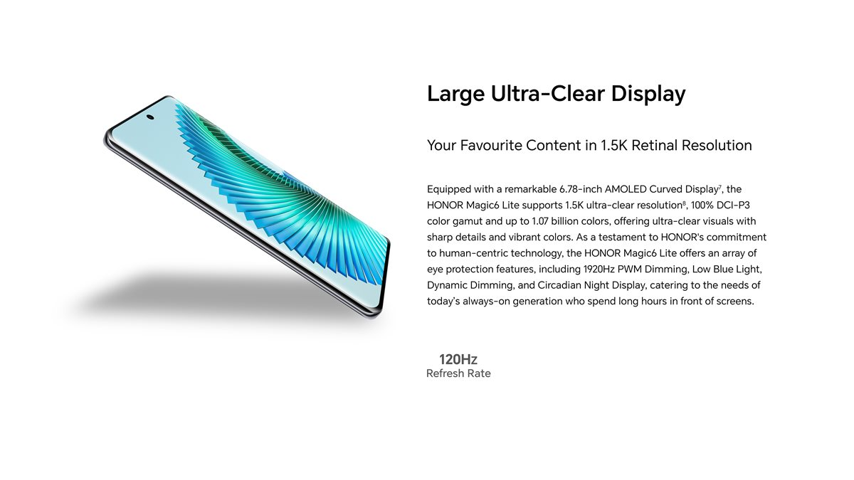 HONOR Magic 6 Lite features a 6.78-inch edgeless AMOLED 120Hz display and a micron-sized gap structure to ensure a 360-degree drop resistance. It supports 1.5K resolution (429PPI), 1.07 billion colours and 100% DCI-P3 to deliver smooth visuals that are sharp and brimming with detail.
