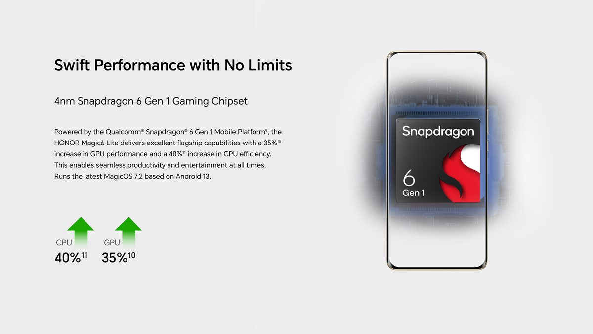 Powerful 4nm Qualcomm Snapdragon 6 Gen 1 Mobile Platform. The HONOR Magic 6 Lite equips with Qualcomm Snapdragon 6 Gen 1 Mobile Platform, which provides exceptional performance and can handle even intensive tasks with ease which are up to 40% and 35% faster than their predecessors respectively and deliver greater AI processing performance to support myriad real-time processing use cases.