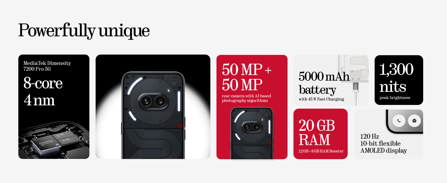 • NOTHING OS 2.5 - Powered by Android 14, it delivers the best of Android with a fast and smooth experience rooted in utility and functional customisation; Nothing Widgets: Little windows into your apps that let you do more directly from your home and lock screen, with Nothing OS 2.5, we’ve expanded our library with even more Nothing-designed widgets, with swipeable views and animations for more levels of information and interactions