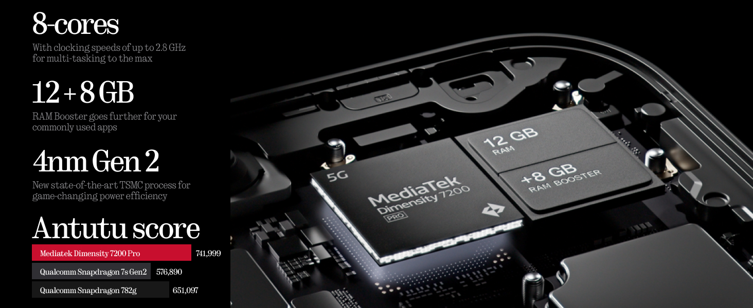 • GO PRO - Co-engineered with MediaTek, the custom Dimensity 7200 Pro processor delivers the ideal performance with optimal power consumption; 8-core with clocking speeds of up to 2.8 GHz for multi-tasking to the max and ideal state-of-the-art TSMC process for game-changing power efficiency