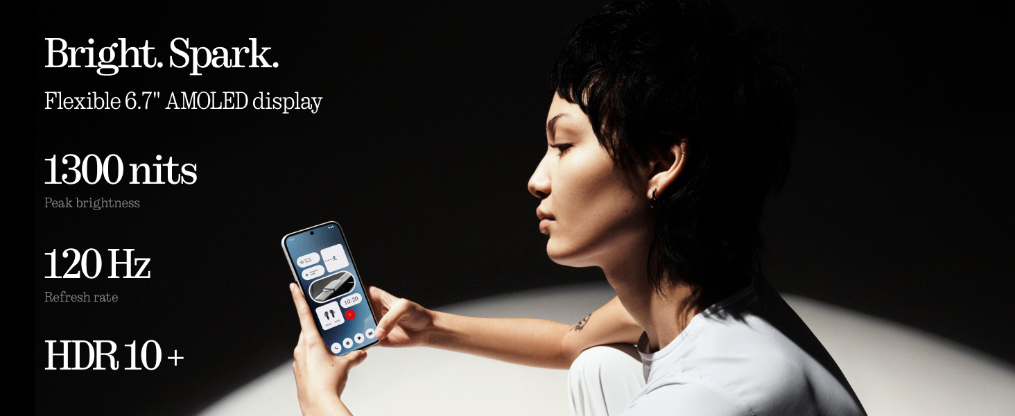 • BRIGHT SPARK - Flexible 6.7 Inch AMOLED display, vibrant colours, deep contrasts, and ultra-slim symmetrical bezels. 1300 nits Peak brightness, 120 Hz Adaptive refresh rate and 1.07 billion vivid colours