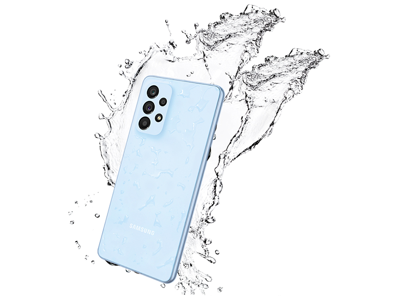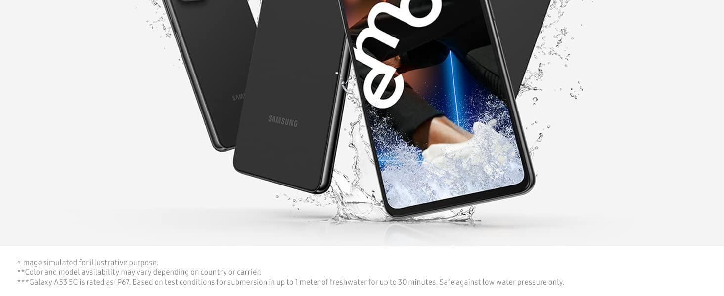 Rated IP67 for water and dust-resistance, the Galaxy A53 5G stands up to 1.0 meter of freshwater for up to 30 minutes.⁵ With additional protection from Gorilla Glass 5, your device is now tougher and less prone to scratches.