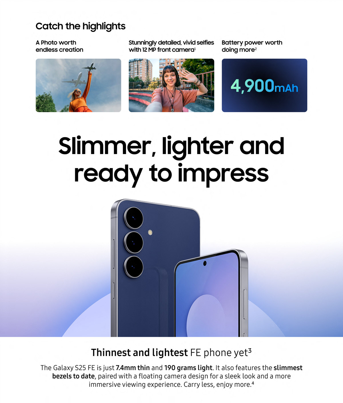 • Slim and lighter design: At just 7.4 mm and 190 g, it’s the slimmest and lightest FE yet; With a floating camera design and super slim bezels, enjoy an immersive viewing experience in a sleek form