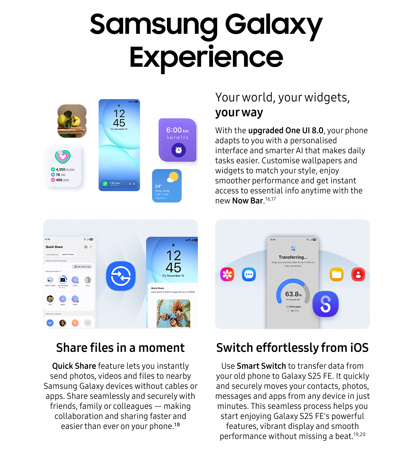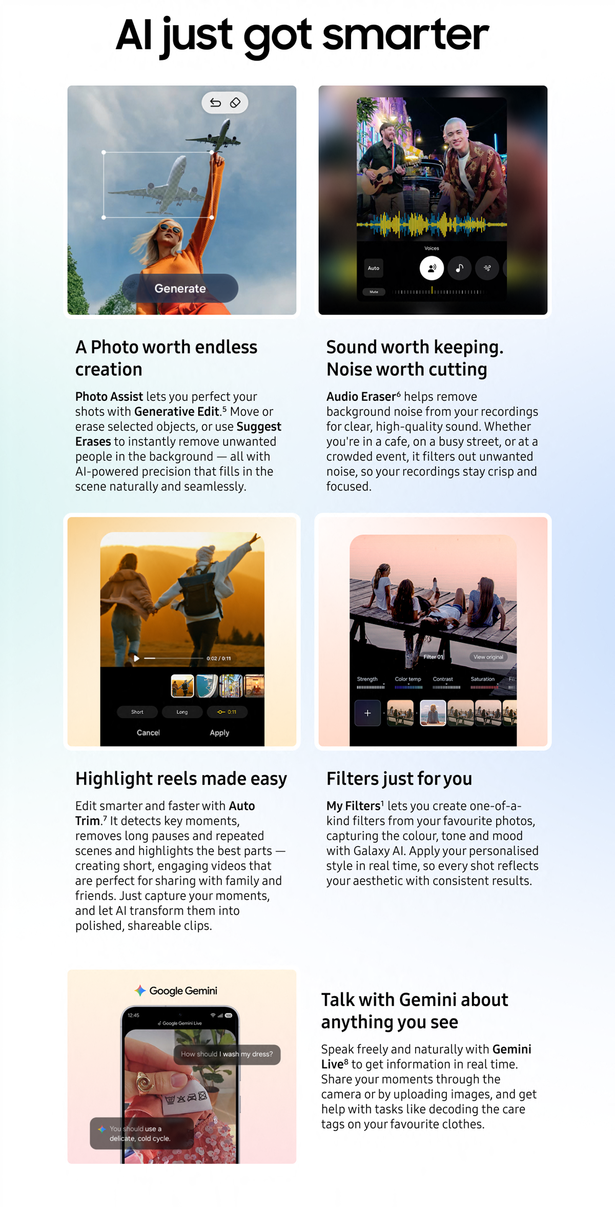 • Galaxy AI is here to make your day easier: Thanks to smarter, more intuitive AI, you can get real-time insights, edit and enhance content with ease, and get personalised rundowns to keep your day on track¹ ² ³ ⁴ ⁵