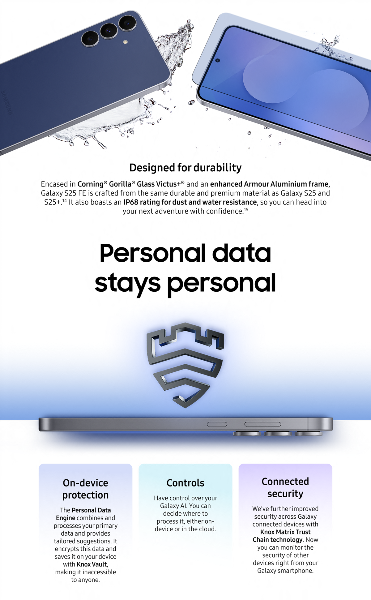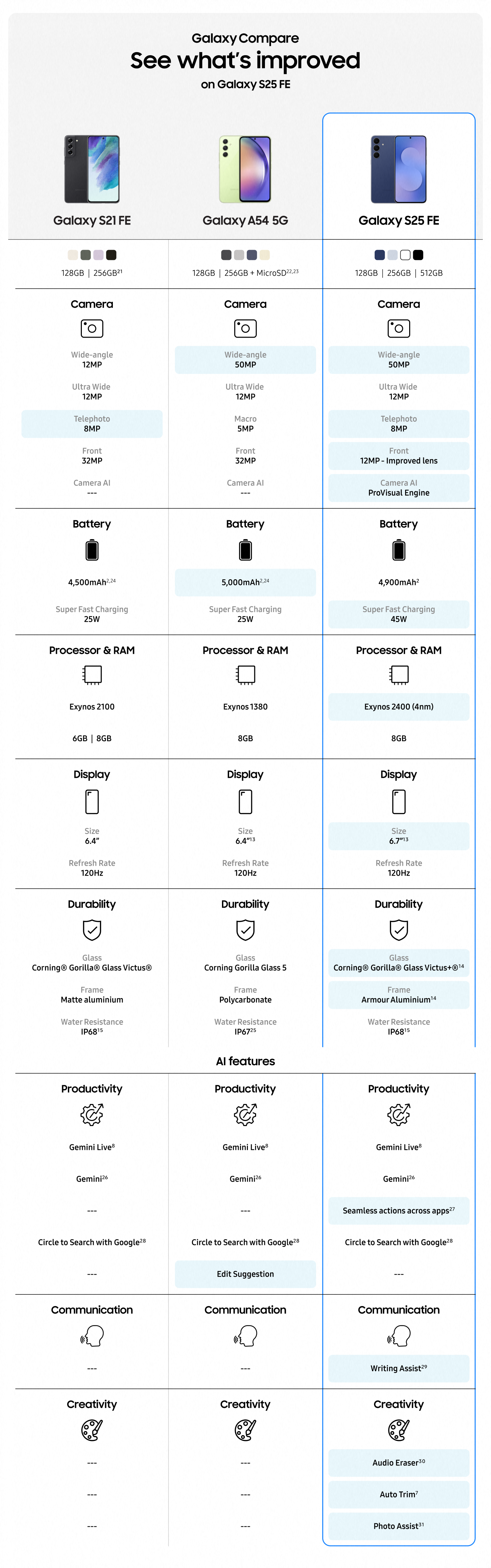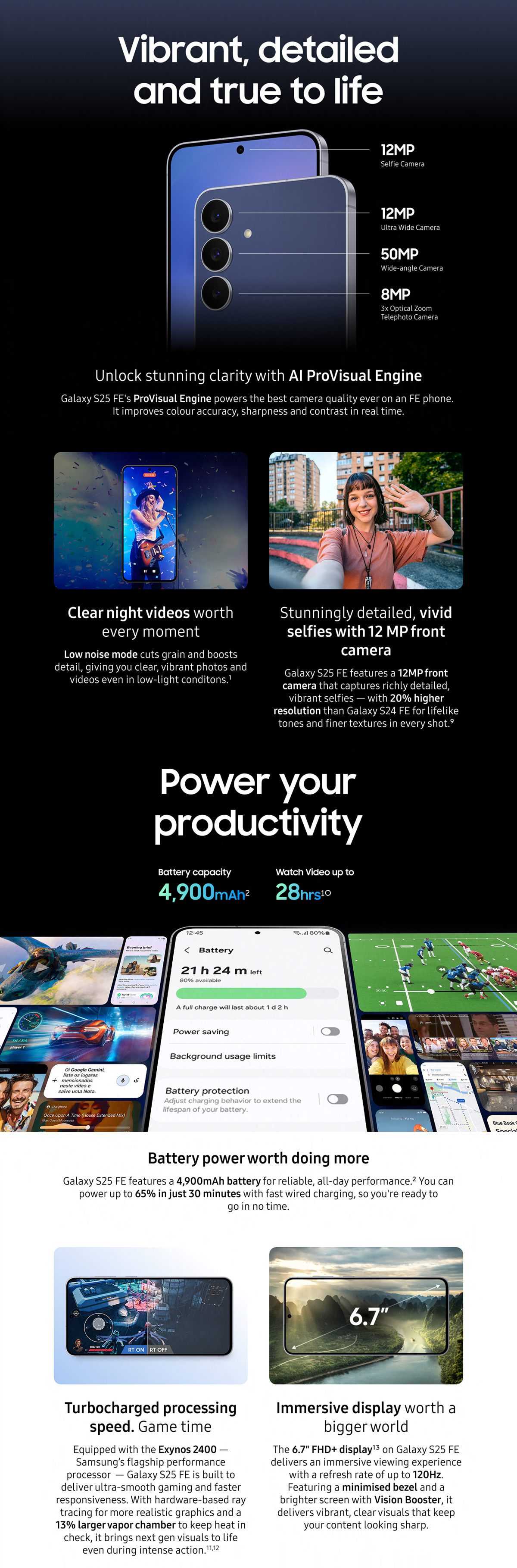 • Galaxy S25 FE AI ProVisual Engine: Enhance your photos and capture your favourite memories with optimised colour, sharpness and contrast in real time; Ensure every shot and video looks vivid, detailed and true to life⁶