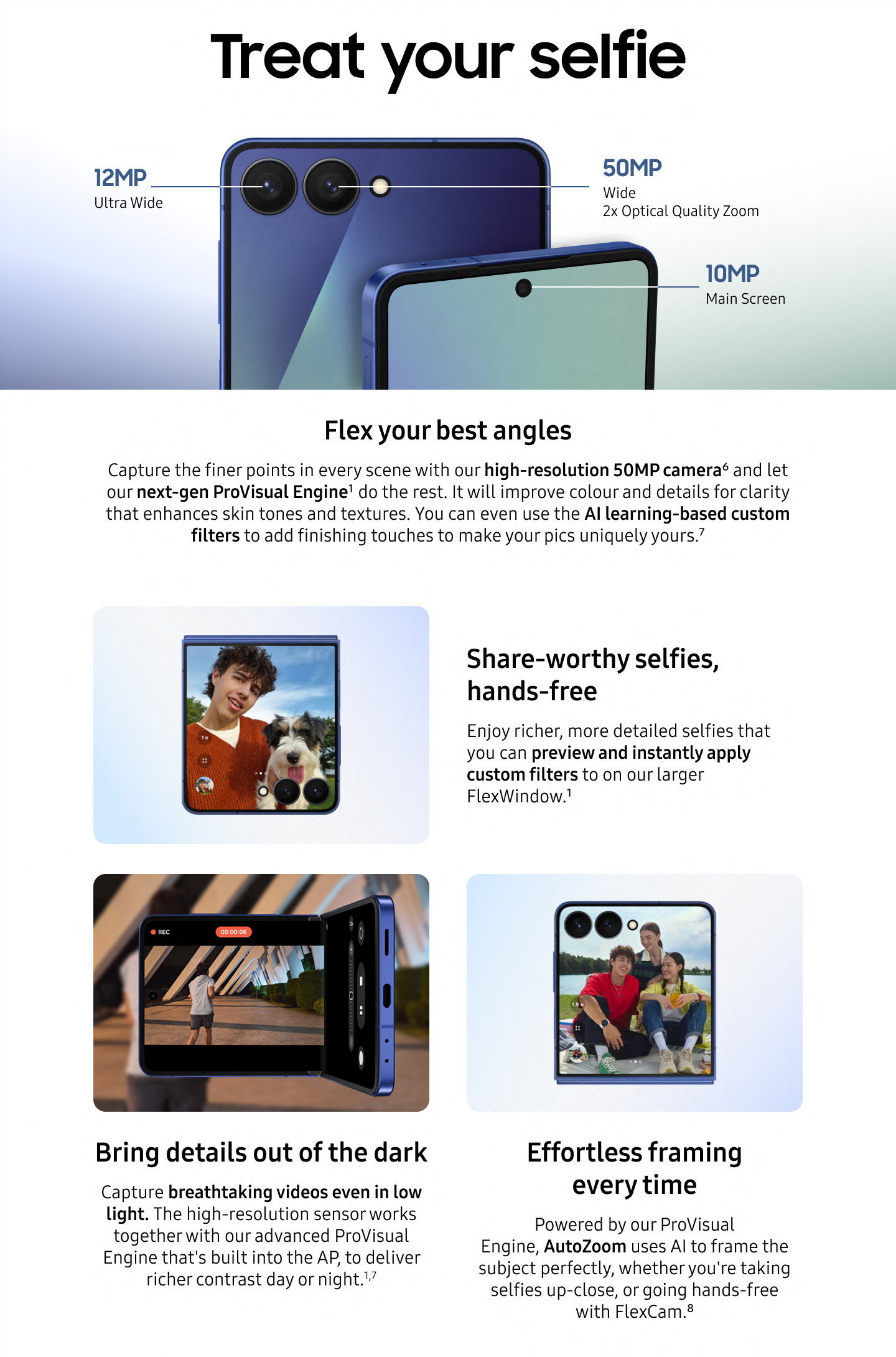 • Introducing One UI 8, all new for Flip smartphones with customisable wallpaper and interactive weather and gallery widgets; Our best, most personalised UI was built from the ground up for the both the main screen and cover screen
