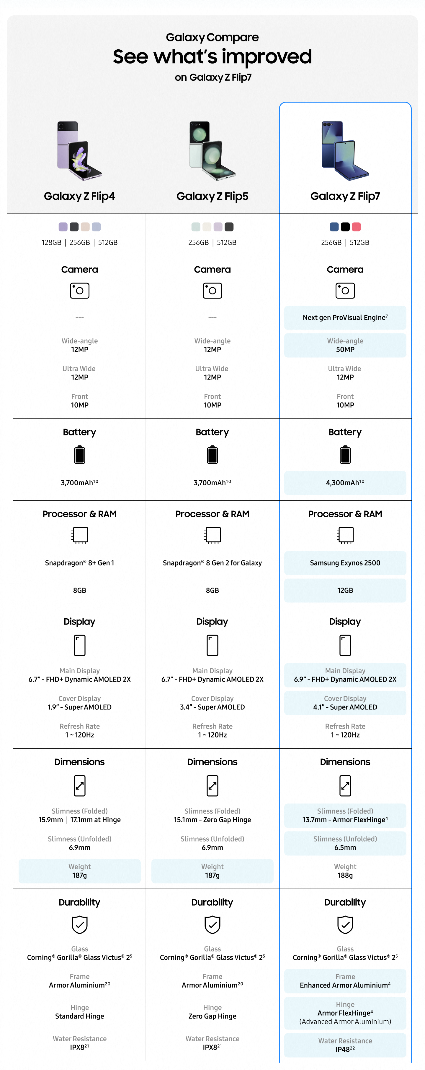 • The Galaxy Z Flip7's redesigned cover screen features our slimmest bezel yet, enabling you to do more from the FlexWindow; When unfolded it is our thinnest Samsung Flip ever with a stunning main screen for an undisrupted viewing experience