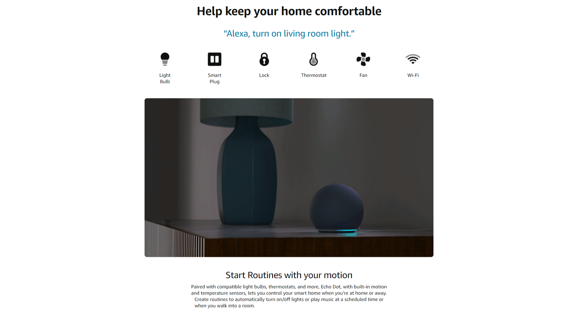• KEEP YOUR HOME COMFORTABLE - Control compatible smart home devices with your voice and routines triggered by indoor temperature sensors. Create routines to automatically start a smart fan if the inside temperature goes above your comfort zone.