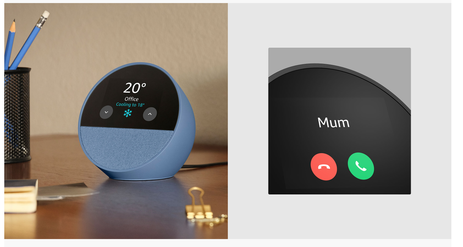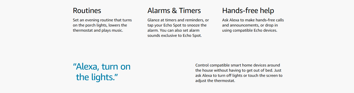 • MEET THE NEW ECHO SPOT – A sleek smart alarm clock with Alexa and big vibrant sound. Ready to help you wake up, wind down and so much more.