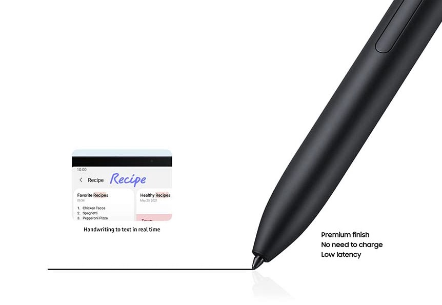 • With low latency and a soft tip, the included S Pen offers a natural writing experience. More than that, it turns handwriting into text in real time and lets you edit text with simple gestures. When you're done, it magnetically snaps to the side for easy carrying - no need to charge S Pen.