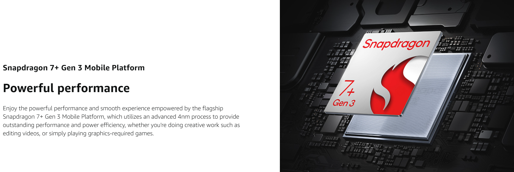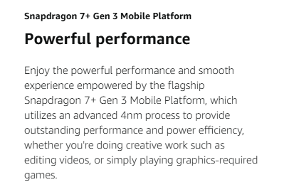 - Snapdragon 7+ Gen 3 Mobile Platform, 4nm process for peak performance, Quad speakers for immersive sound;